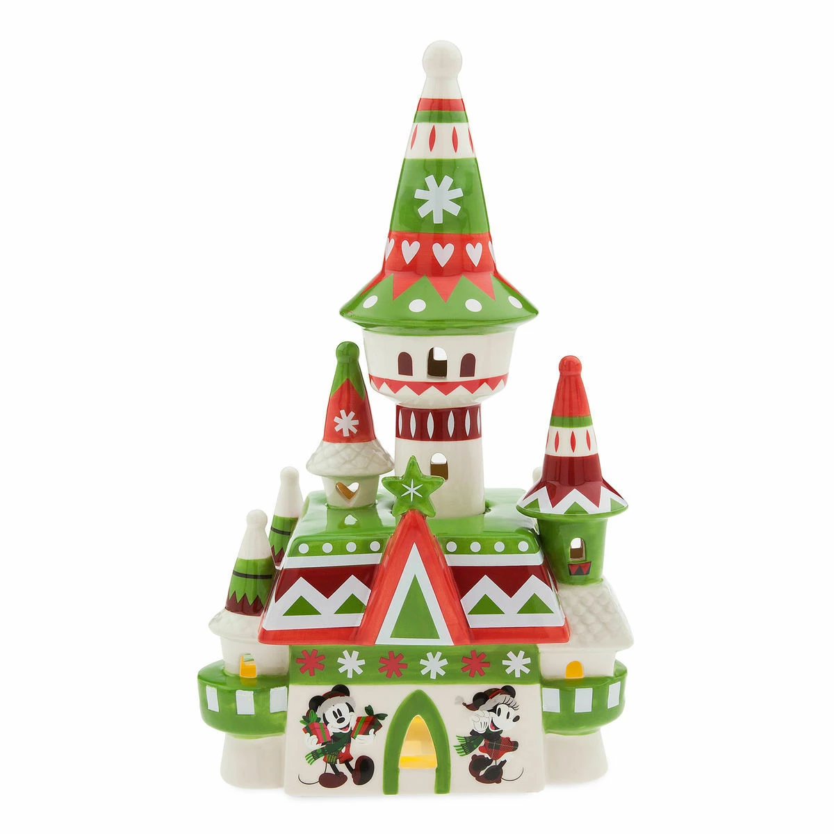 Deck the halls or your holiday table with this lighted Fantasyland castle ceramic sculpture from the Disney Parks, featuring a festive ”Nordic Winter” design, plus Santa Mickey and Minnie art at the gates.