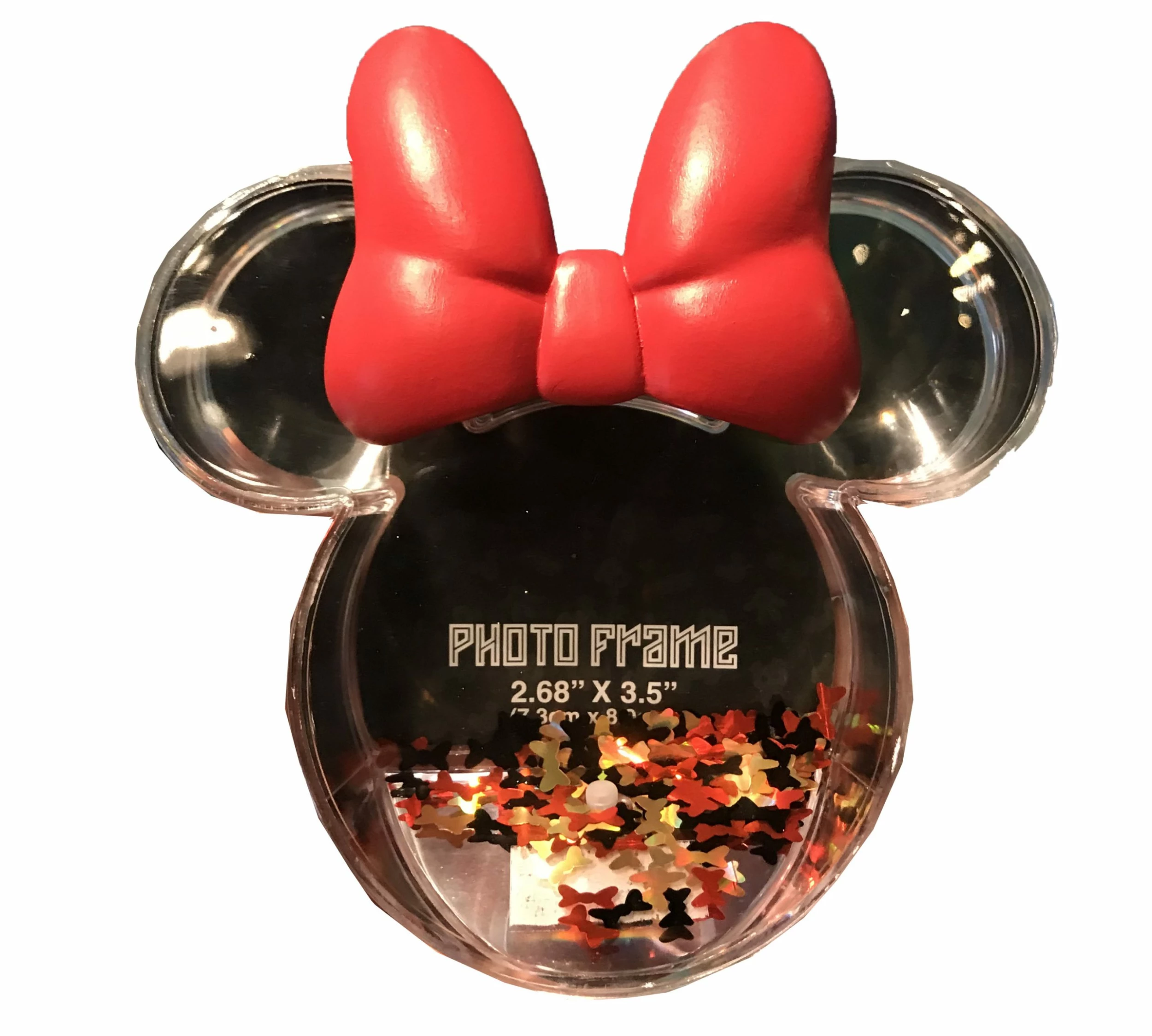 Display your magical memories with this fun snow globe. Features a Minnie Mouse Icon shape with colorful falling bows inside.