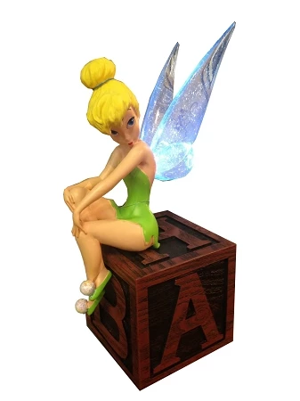 Tinker Bell rests her wings as she sits upon an alphabet block in this detailed figurine inspired by the memorable scene in Peter Pan. Press the button to see Tink’s glittering wings light up!