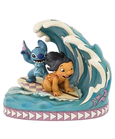this Disney figurine depicts Lilo and Stitch surf boarding, and on a patterned base.